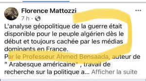 و يبدو أن كتاب ” Arabesque américaine” أضحى مرجعا حتى للمواطنين الأوربيين أنفسهم,أين شهد شاهد من أهلها اليوم في منصة “فايسبوك” و يتعلق الأمر بالمواطنة الفرنسية “فلورونس ماتوزي” التي اعترفت من خلال منشور لها على مستوى الفضاء الأزرق أنها لدى سماعها لتحليلات أحمد ين سعادة و اطلاعها على مؤلفه وجدت صوت الحقيقة و الإستشراف جول كل ما يحاك ضد الدول العربية وحتى فيما يخص ما يجري من خلال الحرب الروسية الأوكرانية,قائلة بأن التحاليل حول الراهن الجيوسياسي كان للجزائريين السبق في الإطلاع عليها.